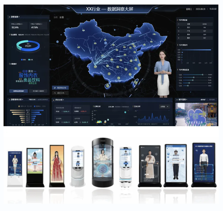AI数字人与数据大屏深度融合,将复杂的企业运营数据转化为动态可视的图表与前瞻洞察。它不仅服务于日常管理决策,更能成为企业宣传、领导视察与客户拜访时的智能展示中枢,让战略决策有“数”可依,让企业实力一目了然。
